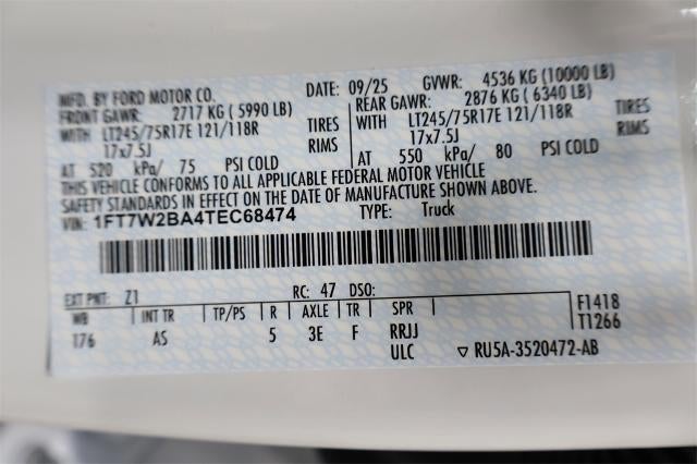 Ford Connectivity Package (1-Year Included), GVWR: 10,000 Lb Payload Package, Internet access capable: 5G Modem - Ford Connectivity Package, Order Code 600A (17" Argent Painted Steel Wheels, HD Vinyl 40/20/40 Split Bench Seat, Radio: AM/FM Stereo with MP3 Player, and SYNC 4), Snow Plow Prep Package, XL Chrome Package (Bright Chrome Hub Covers and Center Ornaments, Chrome Front Bumper, Chrome Rear Step Bumper, and Halogen Fog Lamps), 4-Wheel Disc Brakes, 410 Amp Dual Alternators, 6 Speakers, ABS brakes, Air Conditioning, AM/FM radio, Brake assist, Compass, Delay-off headlights, Dual AGM 68 AH Battery, Dual front impact airbags, Dual front side impact airbags, Electronic Stability Control, Emergency communication system: SYNC 4 911 Assist, Exterior Parking Camera Rear, Front anti-roll bar, Front Center Armrest w/Storage, Front reading lights, Fully automatic headlights, Heated door mirrors, Illuminated entry, LED Roof Clearance Lights, Low tire pressure warning, Outside temperature display, Overhead airbag, Overhead console, Panic alarm, Passenger vanity mirror, Platform Running Boards, Power door mirrors, Power steering, Power windows, Power-Sliding Rear-Window with Defrost, Privacy Glass, Rear reading lights, Rear step bumper, Remote keyless entry, Security system, Speed control, Split folding rear seat, Steering wheel mounted audio controls, Tachometer, Telescoping steering wheel, Tilt steering wheel, Traction control, Trailer Brake Controller, Trip computer, Turn signal indicator mirrors, Upfitter Switches (6), and Variably intermittent wipers.
